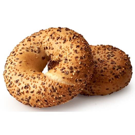 Bułka pszenno-żytnia w kształcie pierścienia z dodatkiem sezamu i siemienia lnaianego. Do produkcji bajgli używamy zaparzonej mąki żytniej. Proces ten w naturalny sposób przedłuża ich świeżość oraz nadaje im charakterystyczną gąbczastą strukturę.